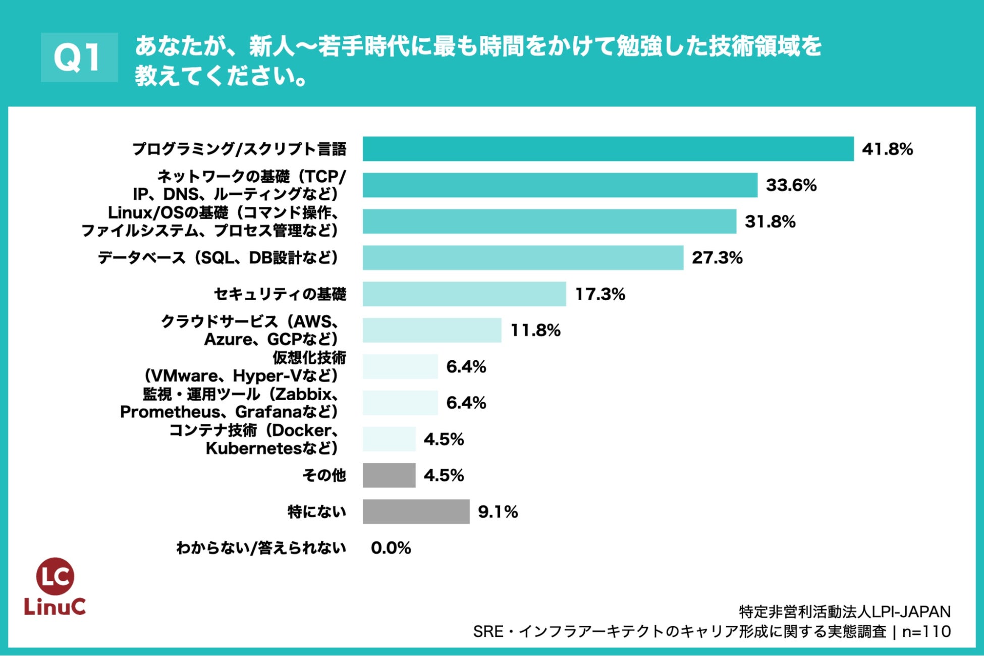 「Q1. あなたが、新人~若手時代(入社1~5年目頃)に最も時間をかけて勉強した技術領域を教えてください。(上位3つまで回答可)」(n=110)と質問したところ、「プログラミング/スクリプト言語」が41.8%、「ネットワークの基礎(TCP/IP、DNS、ルーティングなど)」が33.6%、「Linux/OSの基礎(コマンド操作、ファイルシステム、プロセス管理など)」が31.8%という回答となりました。