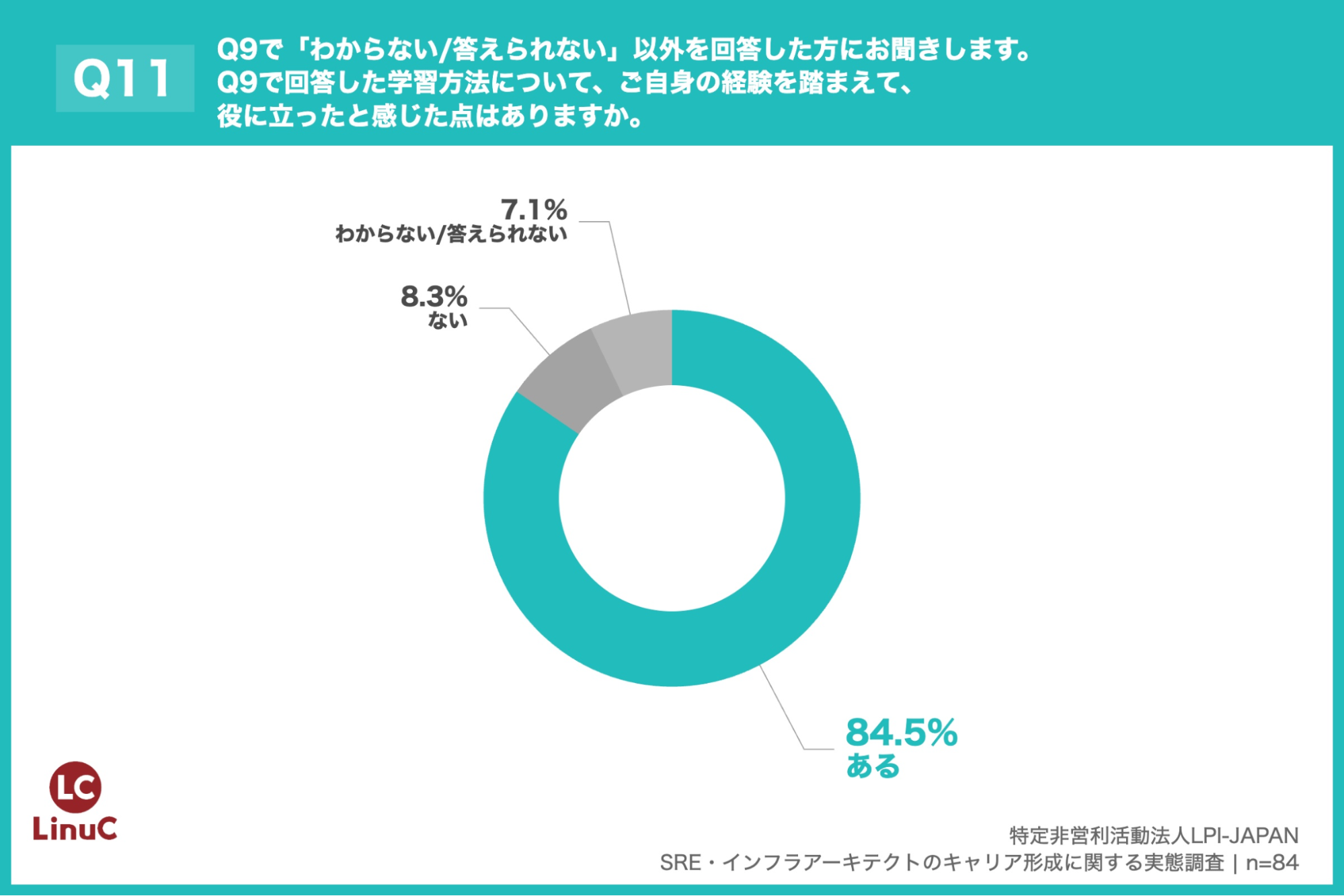 「Q11. Q9で「わからない/答えられない」以外を回答した方にお聞きします。Q9で回答した学習方法について、ご自身の経験を踏まえて、役に立ったと感じた点はありますか。」(n=84)と質問したところ、「ある」が84.5%、「ない」が8.3%という回答となりました。