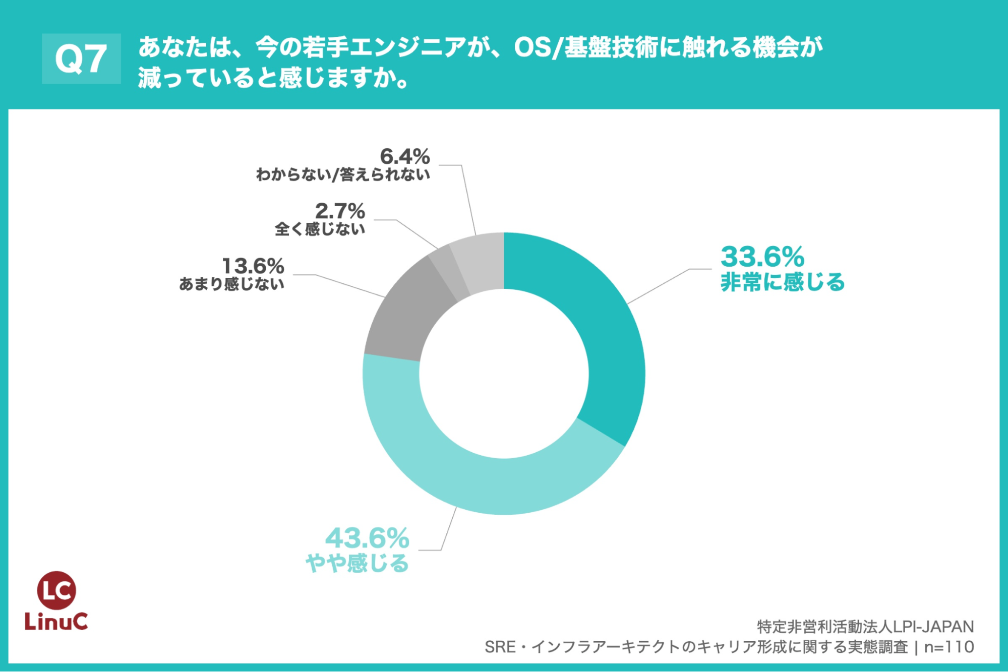 「Q7. あなたは、今の若手エンジニアが、OS/基盤技術に触れる機会が減っていると感じますか。」(n=110)と質問したところ、「非常に感じる」が33.6%、「やや感じる」が43.6%という回答となりました。