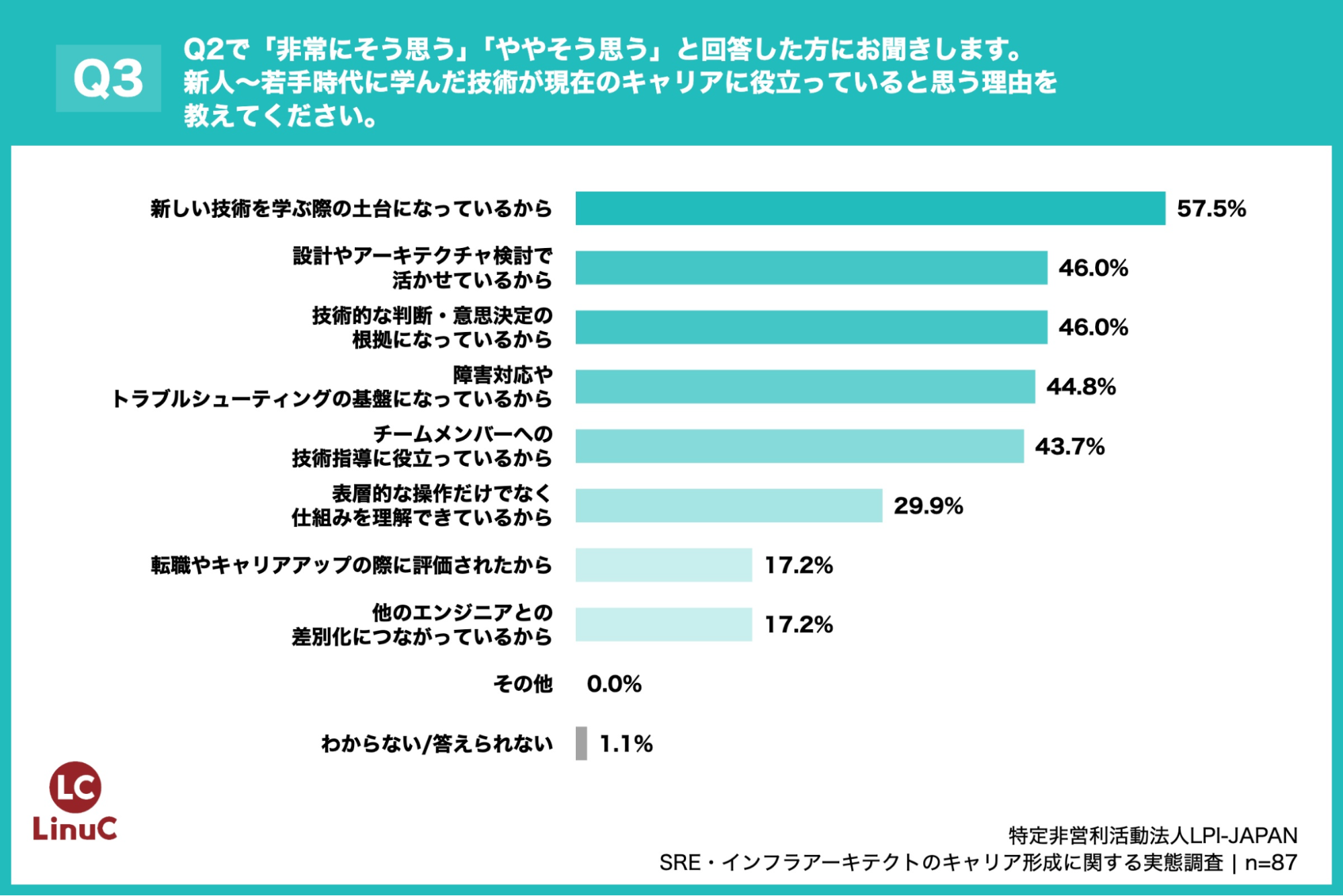 87.0%のエンジニアが、若手時代に学んだ技術が現在のキャリアに役立っていると回答しました。その理由として最も多かったのは「新しい技術を学ぶ際の土台になっているから」(57.5%)。また77.3%が、今の若手にもLinux/OS基盤技術の学習を勧めると答えています。
