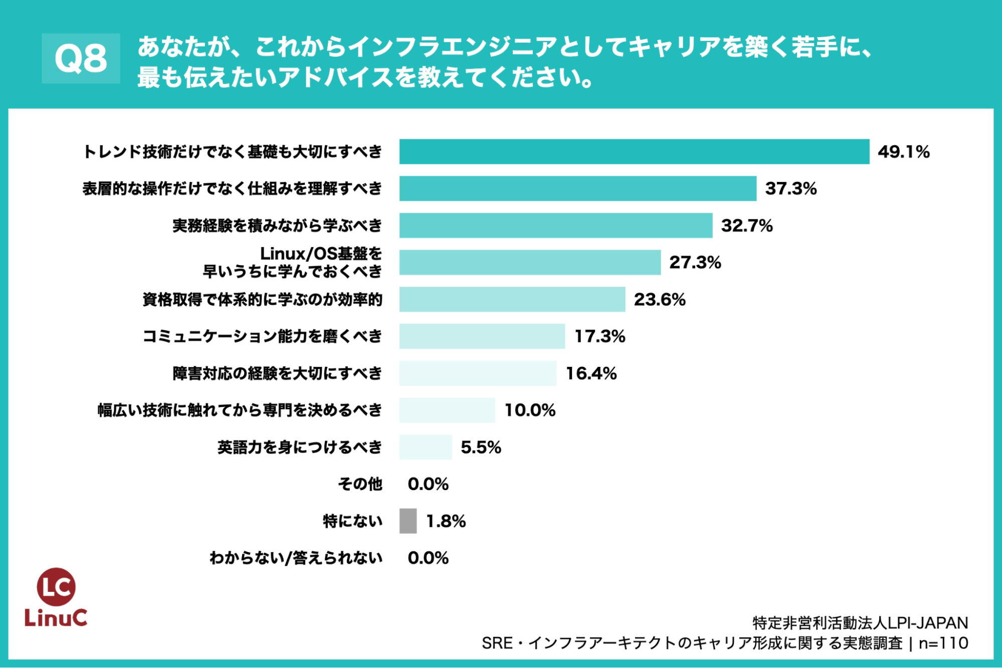「Q8. あなたが、これからインフラエンジニアとしてキャリアを築く若手に、最も伝えたいアドバイスを教えてください。(上位3つまで回答可)」(n=110)と質問したところ、「トレンド技術だけでなく基礎も大切にすべき」が49.1%、「表層的な操作だけでなく仕組みを理解すべき」が37.3%、「実務経験を積みながら学ぶべき」が32.7%という回答となりました。