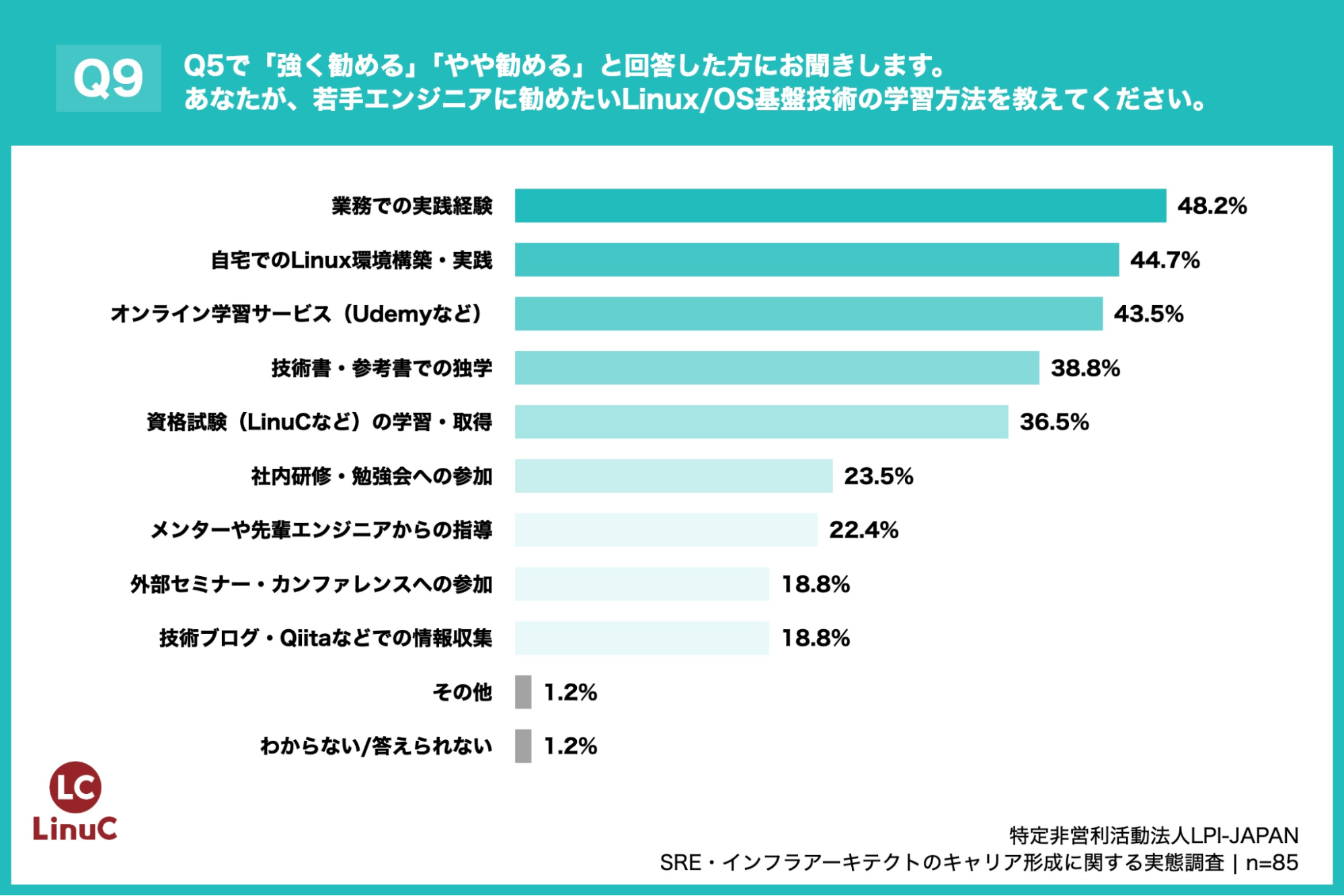 「Q9. Q5で「強く勧める」「やや勧める」と回答した方にお聞きします。あなたが、若手エンジニアに勧めたいLinux/OS基盤技術の学習方法を教えてください。(複数回答)」(n=85)と質問したところ、「業務での実践経験」が48.2%、「自宅でのLinux環境構築・実践」が44.7%、「オンライン学習サービス(Udemyなど)」が43.5%という回答となりました。