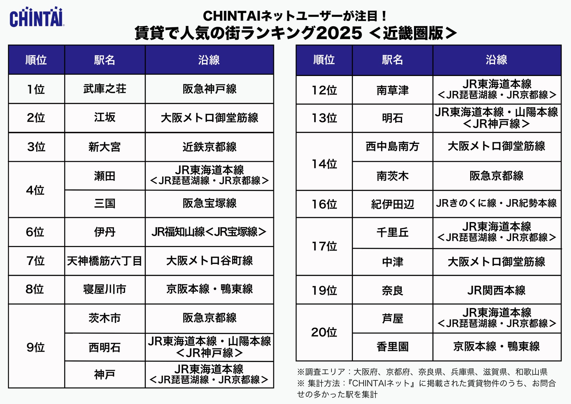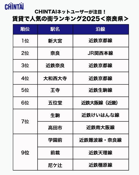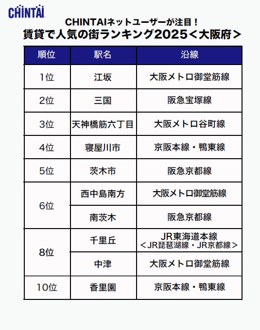 お部屋探しのリーディングカンパニー株式会社CHINTAI(本社:東京都港区 代表取締役社長 奥田倫也)は、賃貸物件検索サイト『CHINTAIネット』に掲載された近畿圏の賃貸物件のうち、お問合わせの多かった駅を集計し、ランキング化した「CHINTAIネットユーザーが注目!賃貸で人気の街ランキング2025」近畿圏版を発表します。