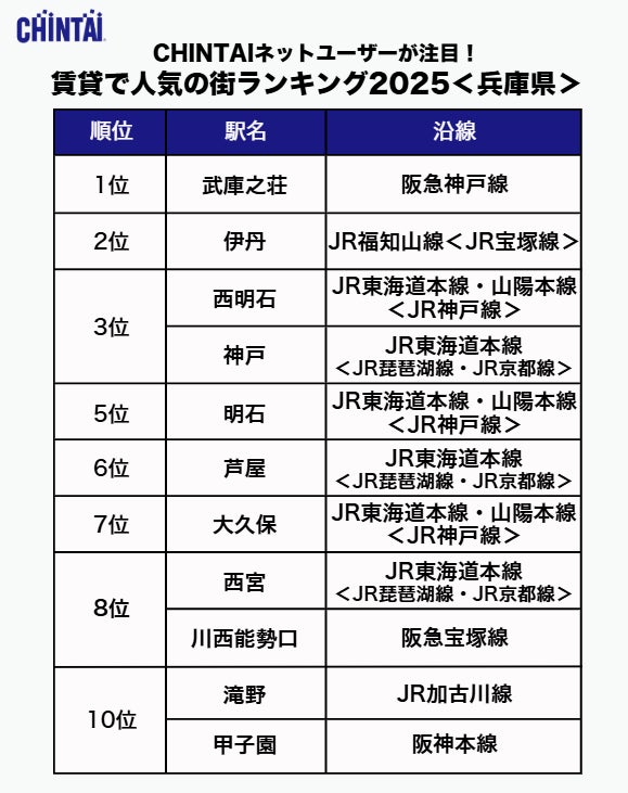 1位は「武庫之荘」!人気の街はターミナル隣駅&住環境充実エリア!「CHINTAIネットユーザーが注目!賃貸で人気の街ランキング2025」近畿圏版