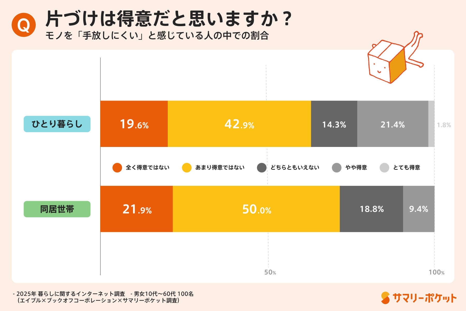 また、モノを「手放しにくい」と感じている人ほど「片付けが苦手」である傾向が見られ、ひとり暮らしの62.5%、同居世帯の71.9%が「片付けが全く得意ではない」「あまり得意ではない」と回答しています。不要なモノだと認識していても、なかなか手放せず、それが片付けや整理整頓の大きな障害となっている様子がうかがえます。