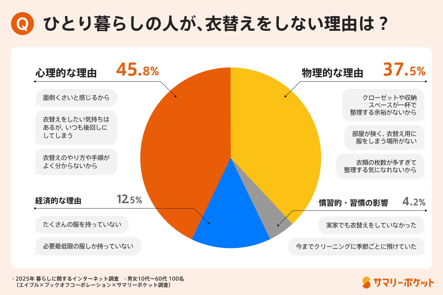 また、「クローゼットや収納スペースが一杯で整理する余裕がない」「部屋が狭くて衣替え用の服をしまう場所がない」「衣類の枚数が多くて整理する気になれない」といった物理的な理由も、衣替えをためらう大きな要因としてあがりました。ひとり暮らし世帯では、この割合が37.5%と、同居世帯の20.0%の約1.9倍にのぼります。