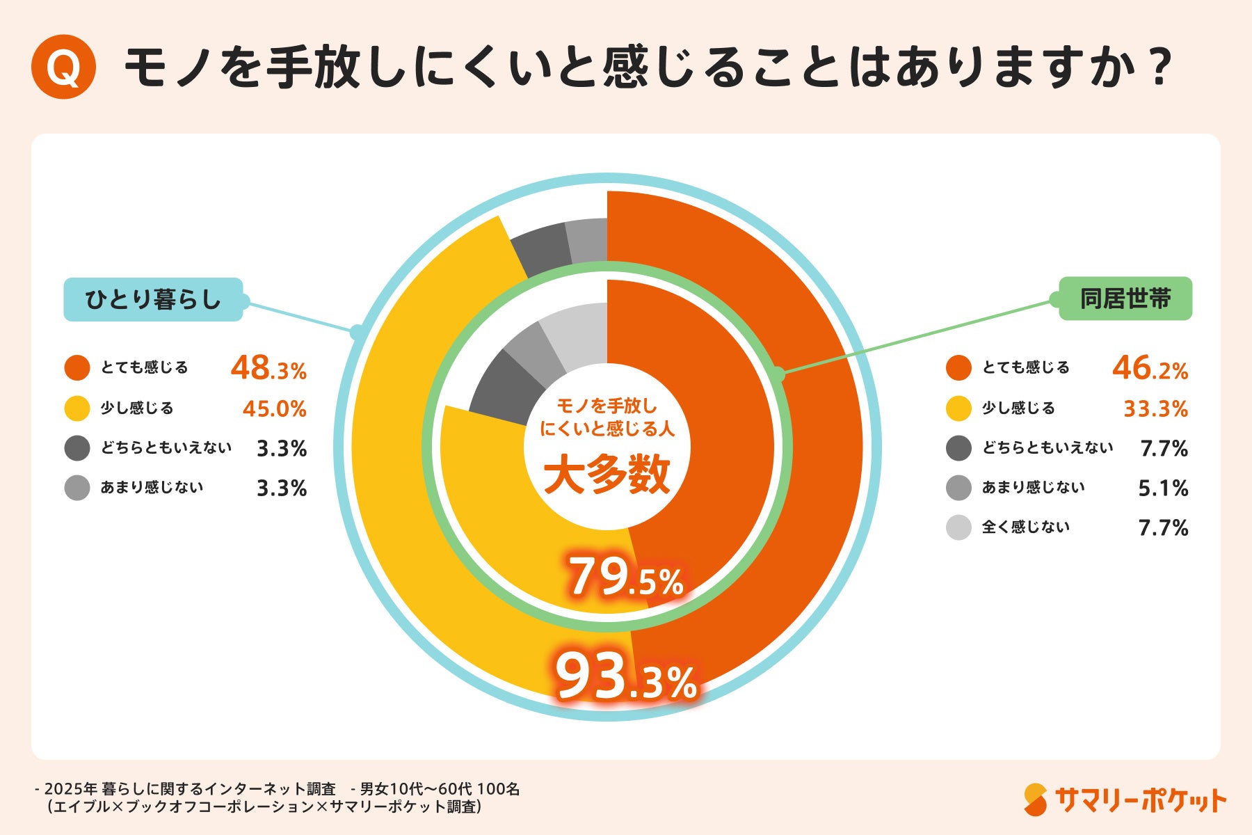 「使わないけれど捨てられないモノがある」と感じている人は現代の日本で多く見られ、住まいへの満足度にも何らかの影響を及ぼしていると考えられます。調査結果からは、ひとり暮らしで93.3%、同居世帯でも8割近くが「モノを手放しにくい」と感じており、住環境にかかわらず多くの人が“モノの呪縛”に悩まされている様子が明らかになりました。