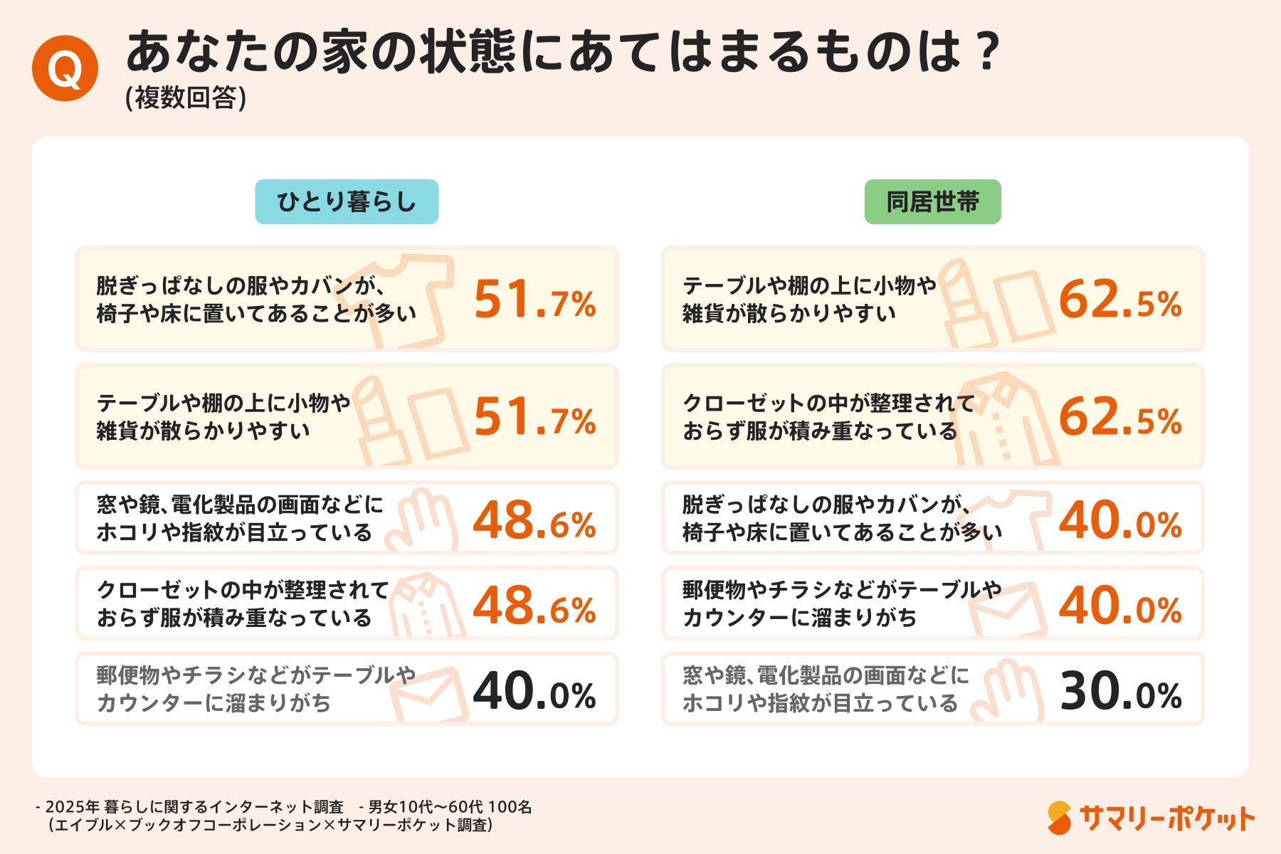 家の状態について尋ねたところ、とくに同居世帯では約6割の人が「クローゼットの中が整理されておらず、服が積み重なっている」と回答しており、ひとり暮らしでもほぼ半数が同様の悩みを抱えています。また、「脱ぎっぱなしの服やカバンが椅子や床に置いてある」という状況も、ひとり暮らしで半数以上、同居世帯でも4割が実感しています。こうした結果から、収納効率の悪さが部屋全体の散らかりやすさに繋がっていることがうかがえます。