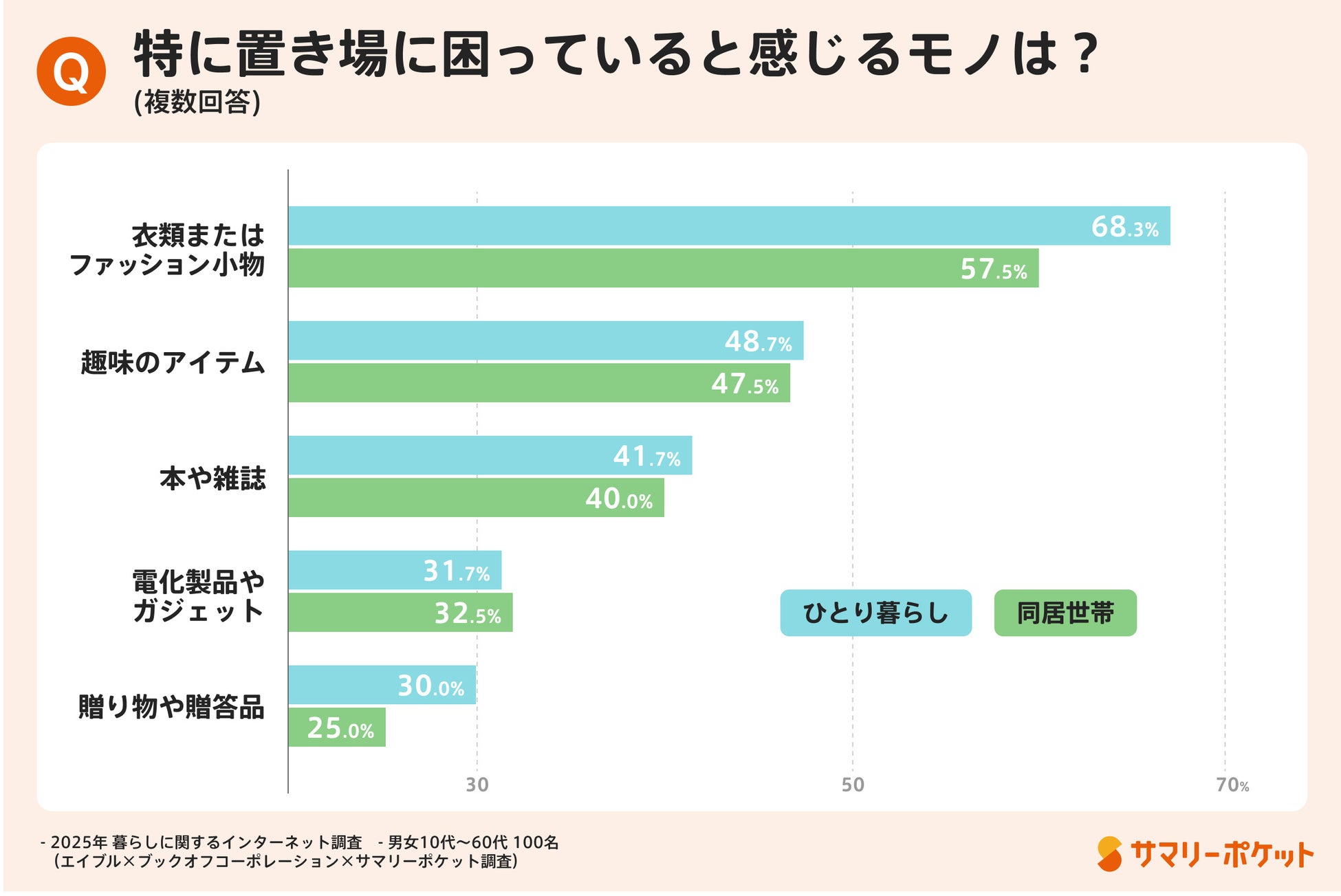 株式会社サマリー(本社:東京都千代田区、代表取締役:日下部康介)が運営する、収納サブスク「サマリーポケット」は、株式会社エイブル(本社:東京都港区、代表取締役社長:吉田晴雄)と、ブックオフコーポレーション株式会社(本社:神奈川県相模原市、代表取締役:堀内康隆)との共同で「暮らしに関するアンケート」を実施いたしました。
