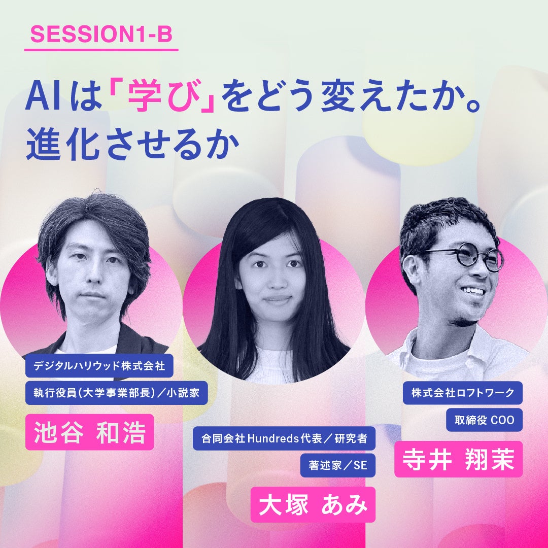 生成AIの登場により、「学び」のあり方やプロセスが大きく変化しています。教育・研究・自己学習・教養など、広義の「学び」を大学や企業はどう捉え直し、進化させていけるか。デジタルと創造性を融合した実践に取り組むデジタルハリウッド大学 事業部長・池谷和浩氏、『#100日チャレンジ 毎日連続100本アプリを作ったら人生が変わった』著者の大塚あみ氏、ロフトワークのAI活用をリードする寺井翔茉が登壇。実践事例を交え、AI時代の学びのヒントを探ります。
