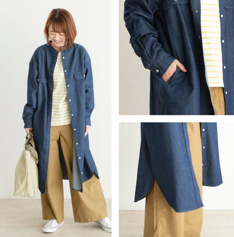 綿100%のライトオンスデニムを使用した、軽やかでやわらかい素材のシャツワンピース。寒い時期にはベストやカーディガンを合わせ、暖かくなったら一枚で着たり、羽織りとしても活躍します。