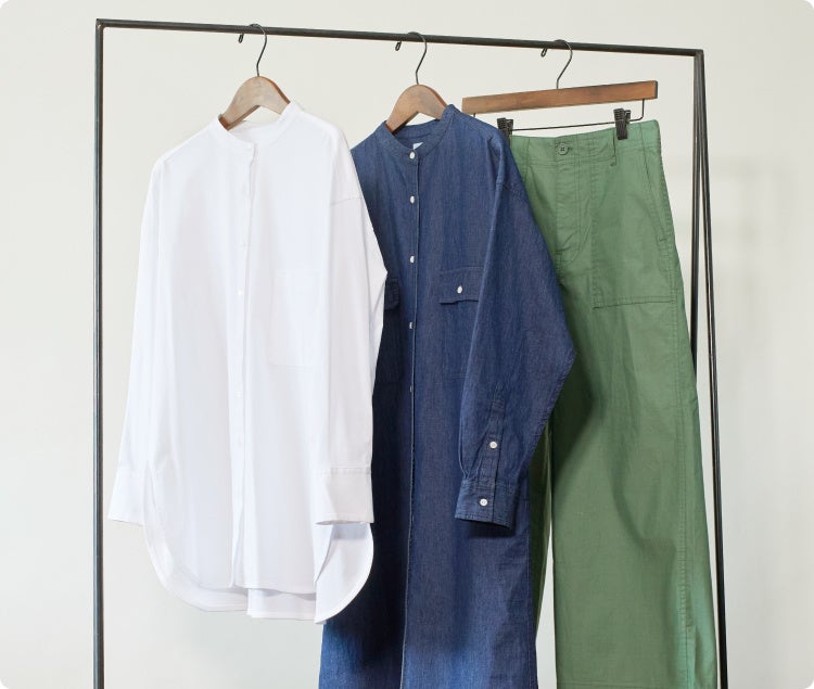楽な着心地ながら、きちんとした雰囲気も兼ね備えたシャツ。顔周りをすっきり見せてくれるバンドカラーがポイントです。一枚で着るのはもちろん、重ね着も楽しめて、ロングシーズン着回せます。