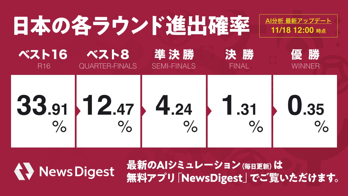 株式会社JX通信社(東京都千代田区/代表取締役 米重 克洋、以下 当社)は、11月20日からカタールで開催予定のサッカーワールドカップ開催に伴い、AIを活用した独自の数理モデルを構築し、すべての試合結果を1万回シミュレーションしました。その結果、優勝確率が最も高い国はブラジル(優勝確率12.2%)で、日本代表がグループリーグを突破する確率は33.9%であることがわかりました。全試合の情報やその集計、国ごとのシミュレーション結果は、当社が20日(日)に公開する「2022サッカーW杯 勝敗確率&優勝国 AIシミュレータ」で提供いたします。日本語と英語の両方で全世界から無料でご確認いただくことが可能です。また、毎日アップデートされる最新シミュレーション結果は、当社のニュースアプリ「NewsDigest(ニュースダイジェスト) 」でご確認いただけます。NewsDigestでは、日本代表戦の結果を予想することでポイントを手に入れることができるキャンペーンを22日(火)から実施します。