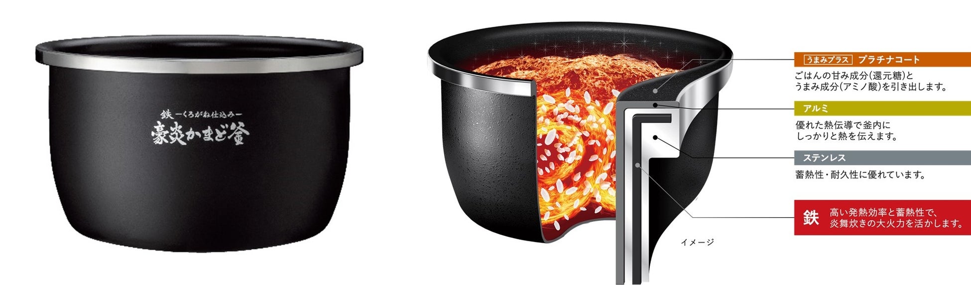「炎舞炊き」で採用している「鉄(くろがね仕込み)豪炎かまど釜」は発熱効率・蓄熱性が高い「鉄」素材を、熱伝導率の高い「アルミ」と耐久性に優れた「ステンレス」に組み込んだ象印独自の内釜です。
