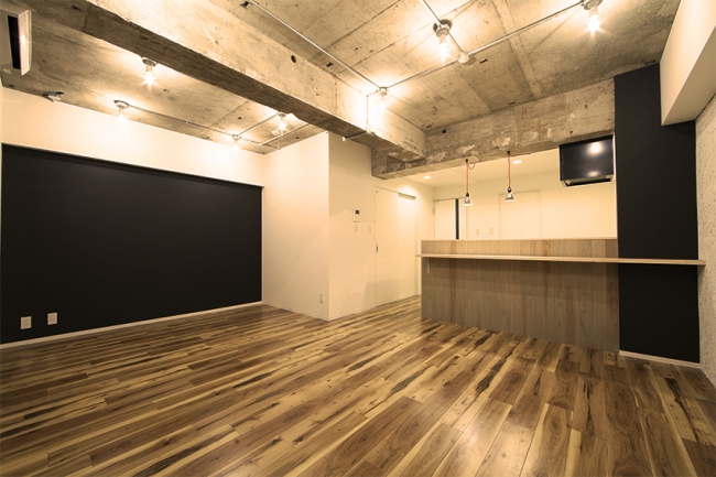「Renotta」では、一部屋一部屋に独自のコンセプトを設定し、住む人の個性に合うように、「一戸一絵のリノベーション」を行っています。今回、新たに「Renotta」に誕生した「UNDRESS LIFE」では、コンクリートと木の素材を活かし、独特の世界観を創り出しています。天井と壁のコンクリートは、それぞれ違う質感のものを採用しており、異素材の組み合わせで空間に深みを出しています。また、白と黒のシンプルなクロスがモダンな印象を与えながらも、ナチュラルな色合いの木板カウンターがあたたかみも演出し、くつろげる住空間としての役割も果たしています。
