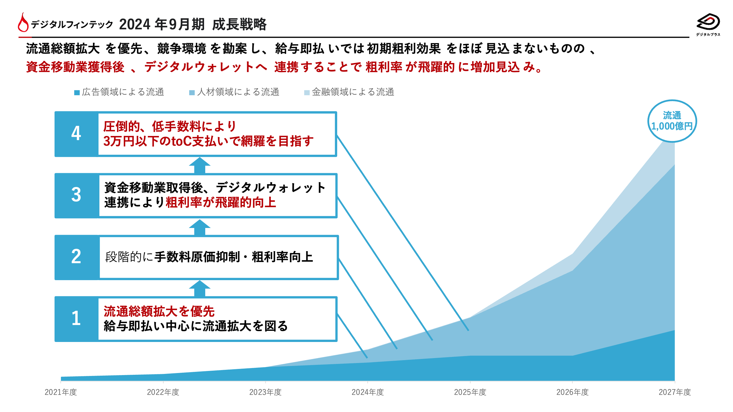 今後も引き続き、流通総額1,000億達成に向けて、「3万円以下のto C現金支払い」を、①マーケティング(広告)領域 ②人材領域 ③支払いのDX(金融)領域の3軸にて網羅を目指してまいります。各領域における取り組みを強化し、2027年9月期に掲げている流通総額1,000億円を達成することで、圧倒的低手数料を実現し、より多くの企業様にご利用いただけるよう、更に邁進してまいります。