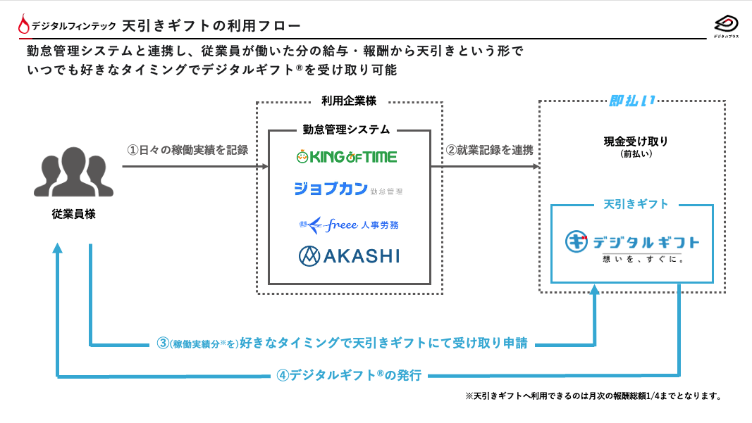 デジタルギフト®は会員登録不要で誰でも簡単に自分の欲しいギフトを自由に選択できるサービスです。天引きギフトでは、従業員様が受け取り予定の給与・報酬からデジタルギフト®︎を購入する形(天引き)でデジタル受け取りを実現いたします。これにより「PayPay」・「すかいらーくご優待券」などのデジタル決済が可能なキャッシュレスサービスで直接受け取ることが可能になります。