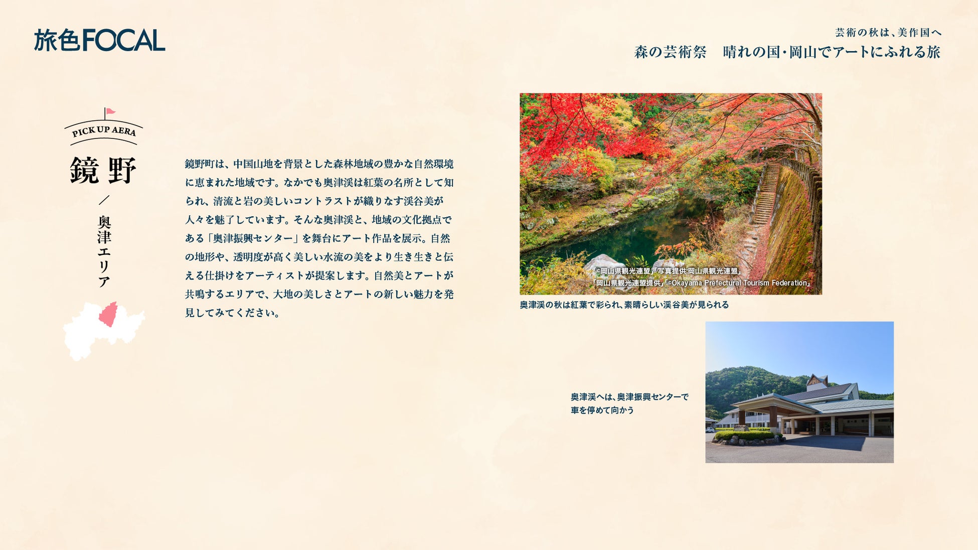 本特集では、特にイチオシのエリアを5つピックアップ。例えば奥津渓(おくつけい)では、10月下旬から11月中旬までは紅葉の絶景が広がる中、アート作品と自然が調和する世界を楽しむことができます。ほかにも、作品が展示されているスポット周辺には立ち寄りたい観光スポットも。