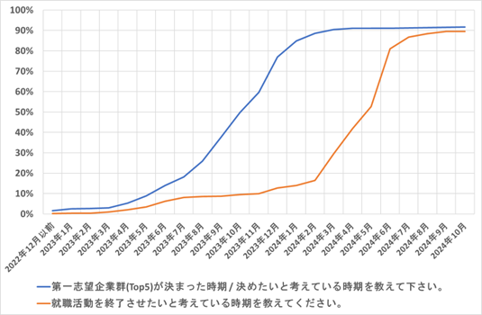 図表1 第一志望企業群(志望企業上位社)の絞り込み予定時期 / 就活終了希望時期(累積)