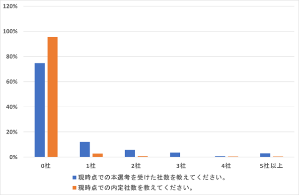 ・内定社数は平均0.1社となった。約95%の学生がまだ内定を持っていない。