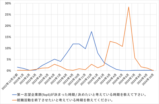 25卒学生の第一志望企業群確定時期・就活を終了させたい時期について