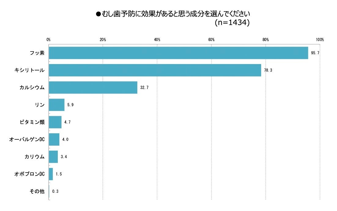 むし歯予防に効果があると思う成分は、1位「フッ素」、2位「キシリトール」、3位「カルシウム」となりました。