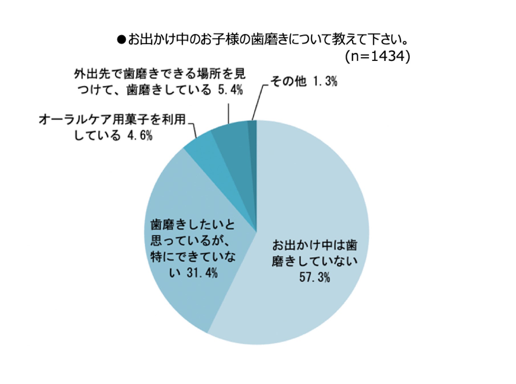 むし歯の予防に気をつけているママ・パパが多い一方で、お子様が歯磨きを嫌がる「歯磨きイヤイヤ」に悩まされる方は、「毎日悩まされている」が31.2%、「頻繁に悩まされている」が20.5%、「たまに悩まされている」が25.7%と、全体の8割弱でした。また、お出かけ中の歯磨きについて、「お出かけ中は歯磨きしていない」が57.3%、「歯磨きをしたいと思っているができていない」が31.4%と、約9割の方がお出かけ中に歯磨きができていないことがわかりました。