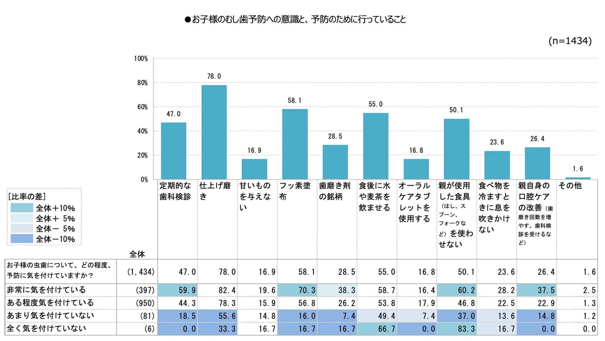 「非常に気をつけている」と答えた方の場合、予防のために行っていることで全体の平均と比べ差が大きかったのは「定期的な歯科検診」と「フッ素塗布」、「親が使用した食具(はし、スプーン、フォークなど)を使わせない」となりました。