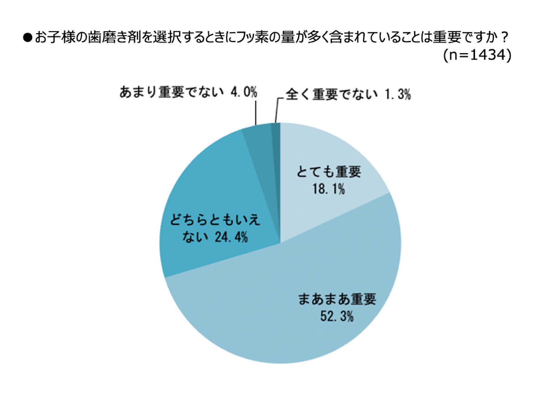 また、お子様の歯磨き剤を選択するときにフッ素の量を重要視しているかという質問に関しては、「とても重要」が18.1%、「まあまあ重要」が52.3%と約7割を占めました。