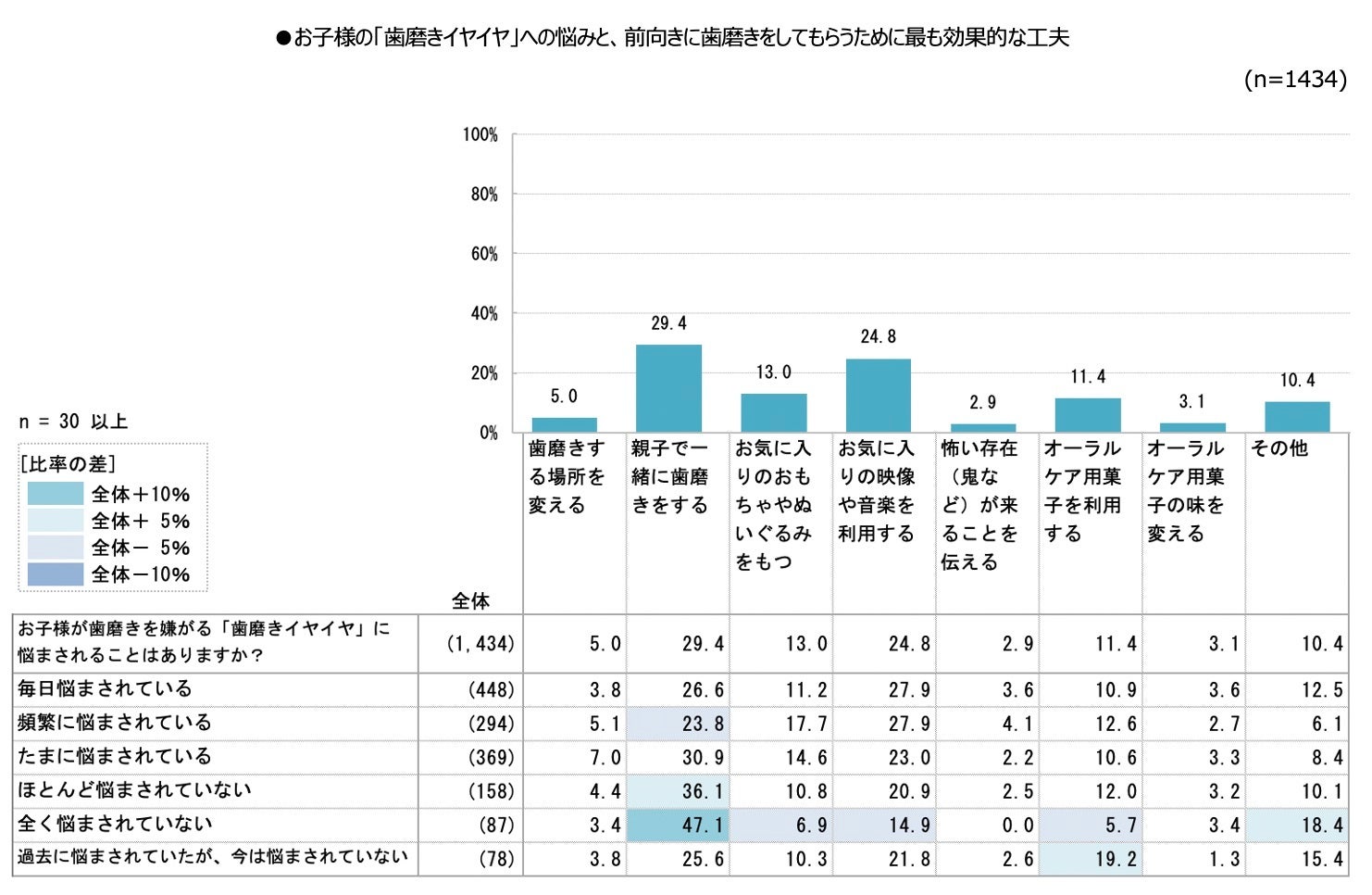 「全く悩まされていない」と答えた方は、「親子で一緒に歯磨きをする」といった工夫をしている方が多く見られ、「過去に悩まされていたが、今は悩まされていない」と答えた方では、「オーラルケア用菓子を利用する」が19.2%と、「親子で一緒に歯磨きをする」「お気に入りの映像や音楽を利用する」に次いで3番目に上がりました。