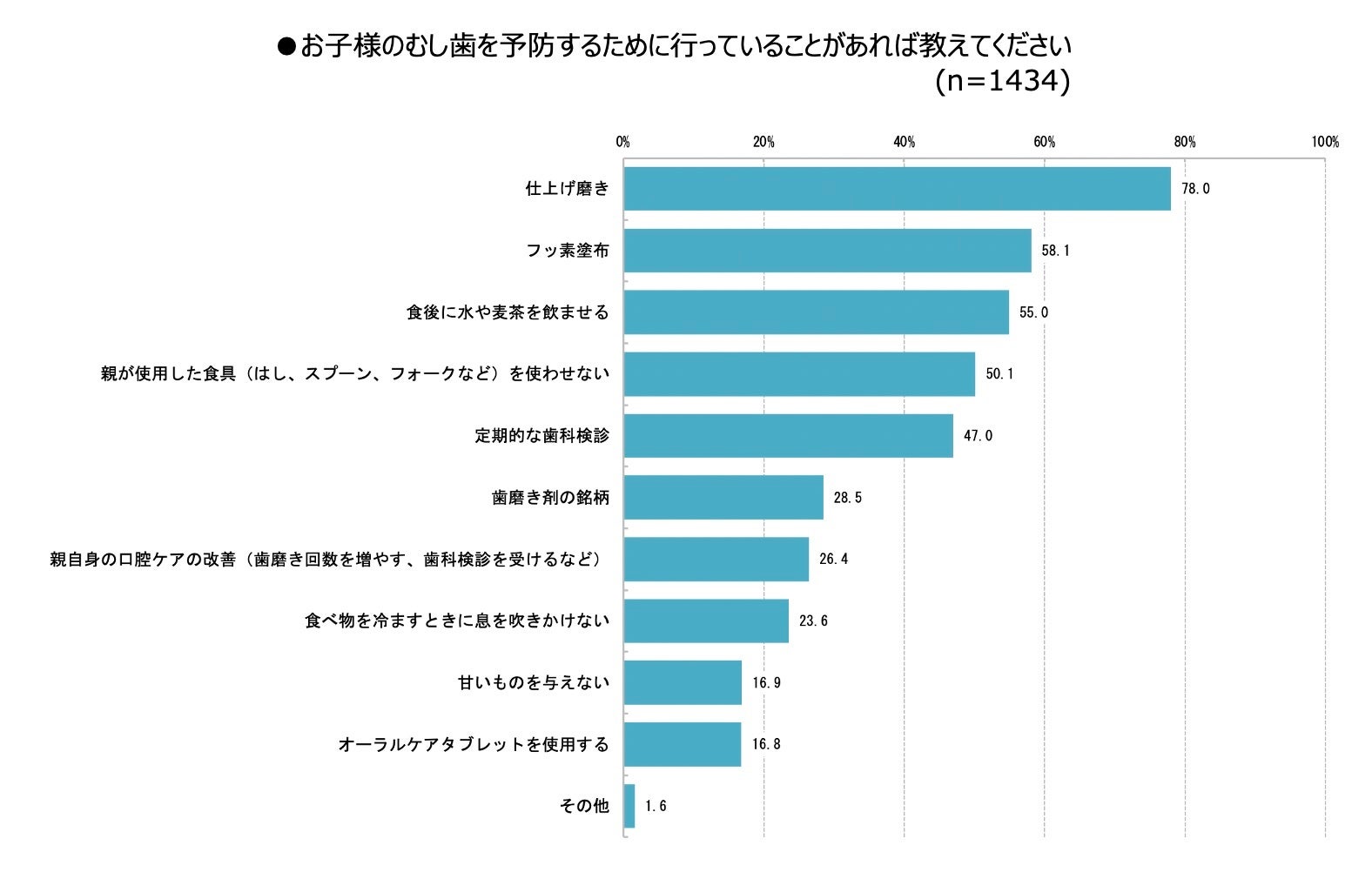 予防するために行っていることとして、1位「仕上げ磨き」、2位「フッ素塗布」、3位「食後に水や麦茶を飲ませる」など。