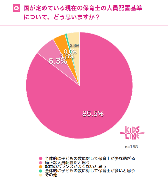 - 保育士の人員配置基準:85.4%が「保育士の数が少なすぎる」