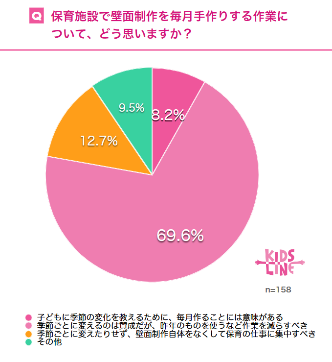 「壁面制作自体をなくして保育の仕事に集中するべき」は12.7%、「子どもに季節の変化を教えるために、毎月作ることに意味があると思う」は8.2%に留まりました。