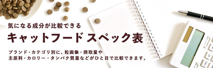 tamaのスペック表は、フード選びの際にポイントとなるカロリーや原材料、サイズのバリエーションなど、飼い主が知りたいことを、ブランド・カテゴリ別に、粒画像・主原料・カロリー・タンパク質量などひと目でわかるようにしています。キャットフード選びの際にぜひ、ご活用ください。