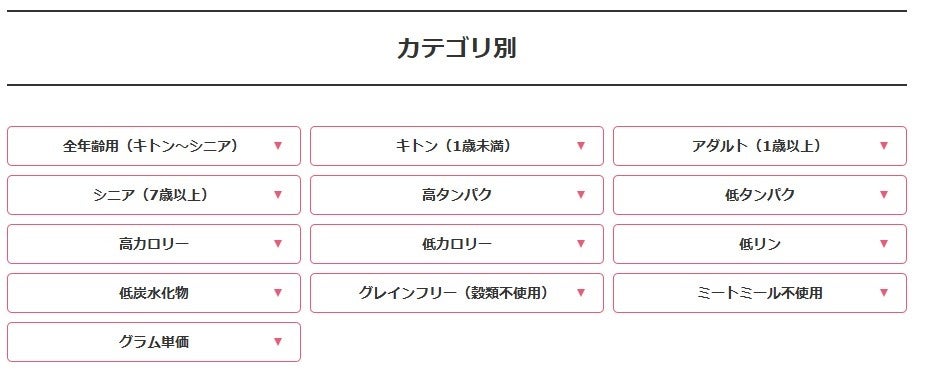 tamaのスペック表は、カテゴリごとに表を表示することも可能です。「キトン」や「高タンパク」、「低リン」など全13のカテゴリを用意しています。探している条件や重視しているポイントに合致しているフードを簡単に探すことができ、その他の項目も表示されるためフードの比較検討がしやすくなっています。