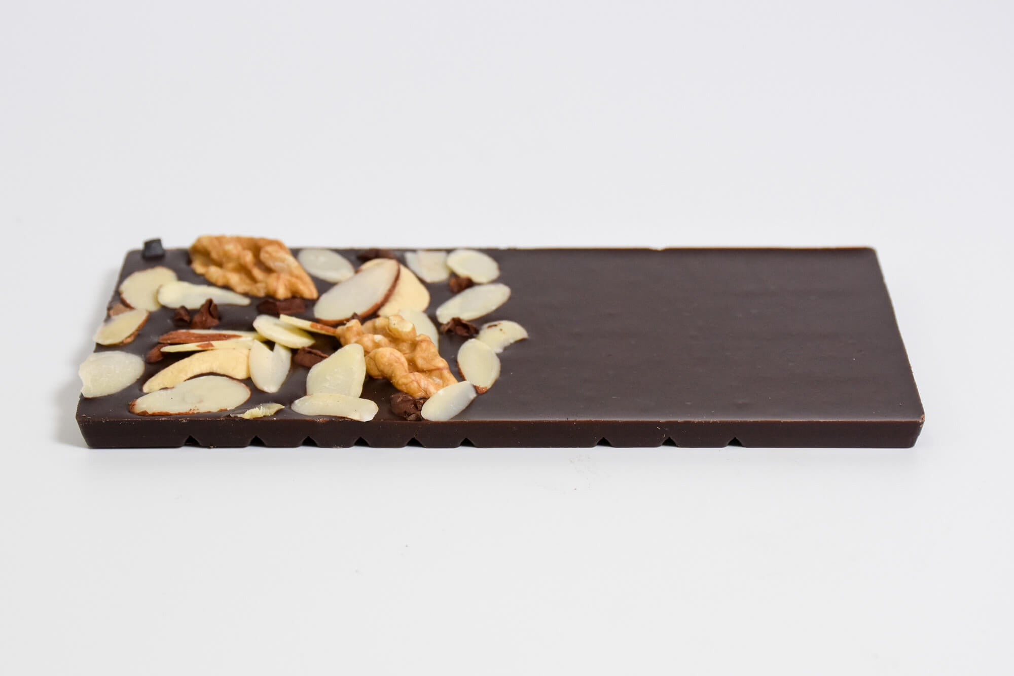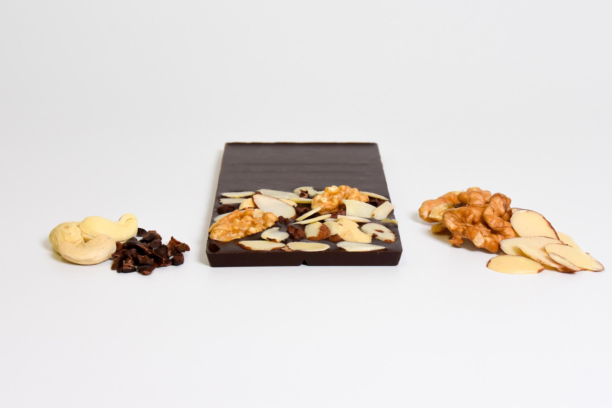 比較的タンパクなナッツ系の風味が特徴のフィリピン産カカオ豆を丁寧に2度焼きし、深煎りに仕上げ、王道のナッツの風味を引き出しました。さらにそのカカオ豆を細挽きと粗挽きとし、2種をブレンドしています。細挽きのみでは、トッピングした3種のナッツがチョコレートの風味に負けてしまいます。ザクザクとした食感のある粗挽きのチョコレートをブレンドすることで、チョコレートがまろやか過ぎてくどいことや、ナッツより目立つ食感でノイズとならないようバランスを調整しました。