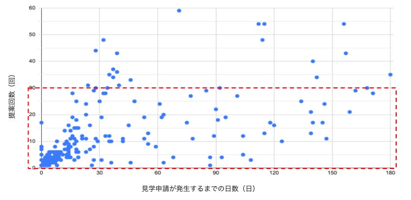 首都圏でプロポクラウドを導入した各社が、約14万人を対象に長期的に物件情報などを自動送付した結果、下図のようになりました。30日以内が一番見学申請が多いですが、フォローし続けることで150日経過した後でも見学申請が発生していることがわかります。
