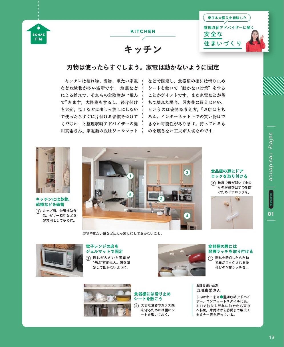 また、多くの防災カタログギフトは掲載点数が約30点ほどなのに対し、「RING BELL SONAE」の商品ラインナップはその約4倍。「カタログギフト」という用途だけではなく、東日本大震災を経験した整理収納アドバイザーによるキッチンやリビングなど部屋ごとの防災対策を紹介するなど、防災備蓄品として足りないもの・必要なものを確認できる「防災読本」としても活用できる作りになっています。