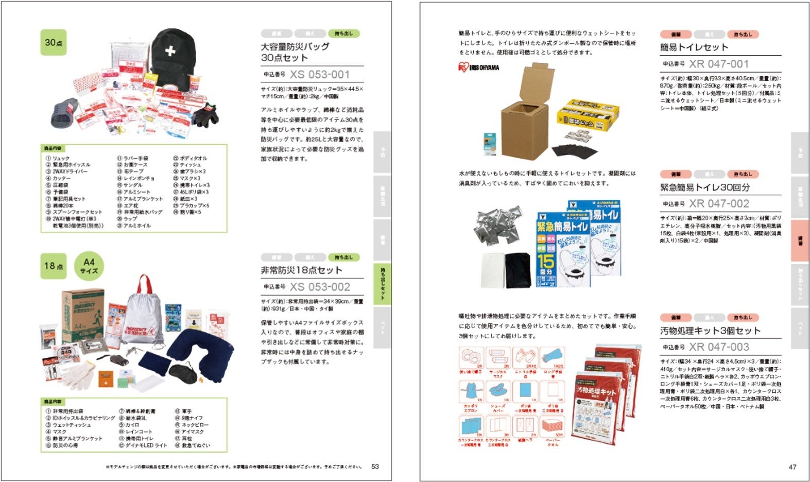 【持ち出しセット】一般的なセットに加え、子供向け、女性向けなど