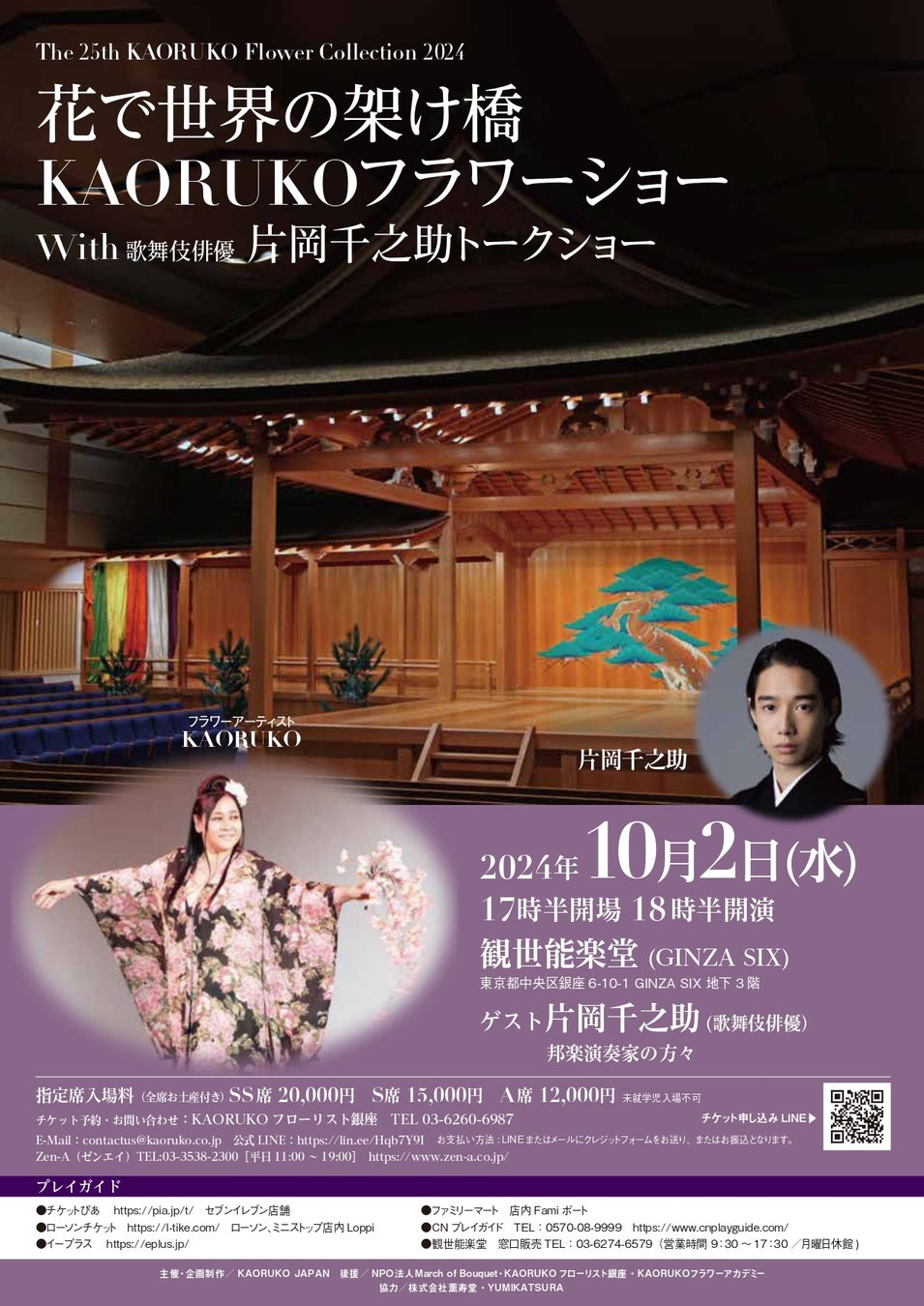 2024年10月2日(水)に、「The 25th KAORUKO Flower Collection 2024 花で世界の架け橋 KAORUKOフラワーショー With 歌舞伎俳優 片岡千之助トークショー」公演を、観世能楽堂にて開催いたします!