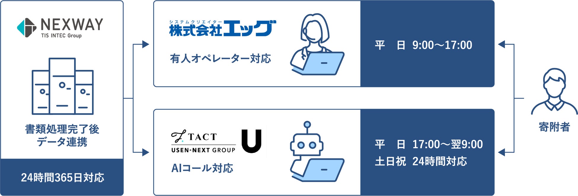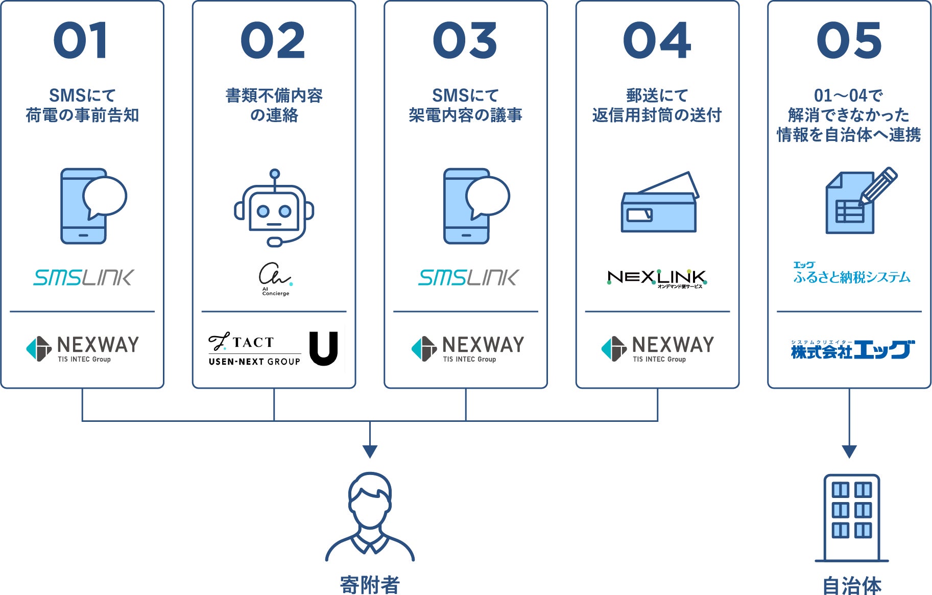 実証実験では、エッグの「ふるさと納税システム」に、ネクスウェイが提供するワンストップ郵送DMサービス「NEXLINKオンデマンド便サービス」やSMS配信サービス「SMSLINK」、TACTが提供する自治体向け音声自動応答サービス(AIコール)「AIコンシェルジュⓇ for LGWAN」を組み合わせることで、自治体の窓口対応時間を拡充し、業務負荷の軽減ができるかを検証します。