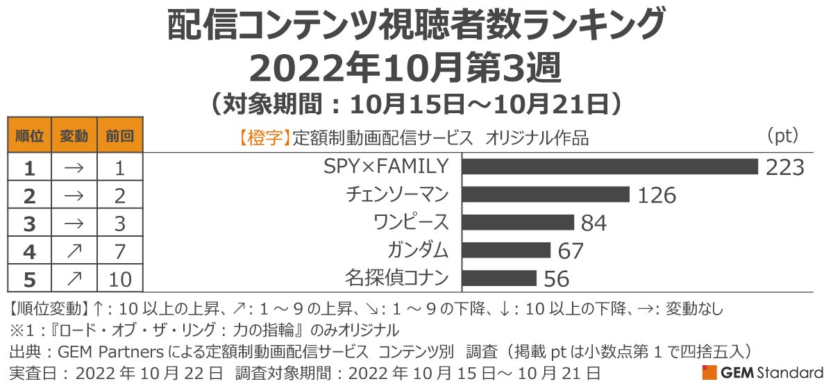 エンタテイメント業界に向けたデータ×デジタルマーケティングサービスを提供するGEM Partners株式会社(ジェムパートナーズ、所在地:東京都港区、代表取締役:梅津文)は10月27日(木)、複数の定額制動画配信サービスを横断して集計した2022年10月第3週の「配信サービス視聴者数ランキング(調査対象期間:10月15日~10月21日、調査対象:日本在住15~69歳男女)」を発表します。