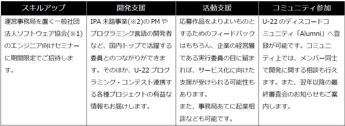 U-22プログラミング・コンテストは、「プログラミング」技術を活用して、自分たちのアイデアを形にした、オリジナルのアプリケーションやサービスを審査するコンテストです。受賞者には副賞だけでなく、自らの成長をさらに促すための、ステップアップの道も整えています。