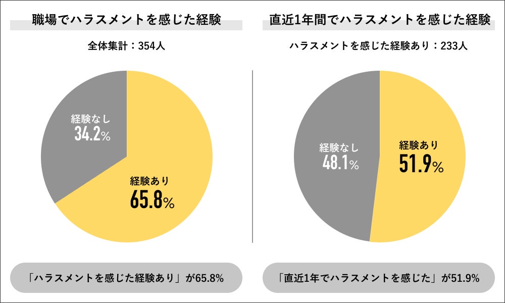 回答者全体の354人に過去職場でハラスメントを感じた経験について聞くと、全体の65.8%が「経験あり」を回答し、「経験なし」は34.2%でした。また過去ハラスメントを感じた経験のある233人に直近1年間でハラスメントを感じた経験を聞くと、「経験あり」が51.9%で、「経験なし」は48.1%の結果になりました。