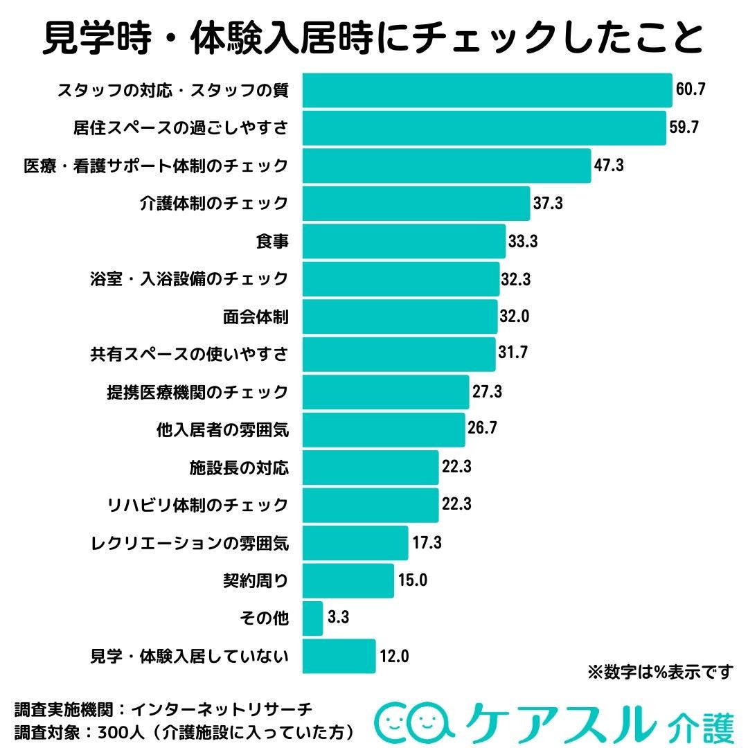 続いて、施設見学・体験入居時にチェックしたことは、「スタッフの対応・スタッフの質」を挙げる方が60.7%で最も多く、順に「居住スペースの過ごしやすさ」(59.7%)、「医療・看護サポート体制のチェック」(47.3%)が並ぶという結果となった。