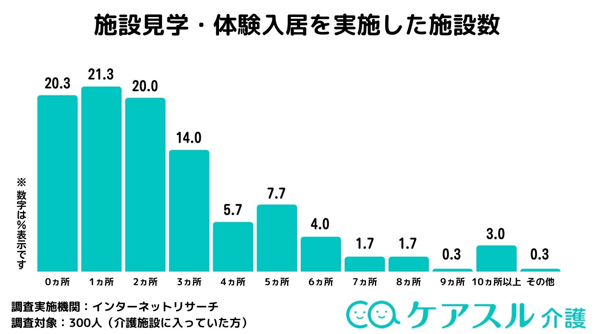 アンケートの結果によると、実際に老人ホームへの入居を決める前の見学や体験入居に行った施設数は「1ヵ所」が21.3%で最も多いという結果となった。