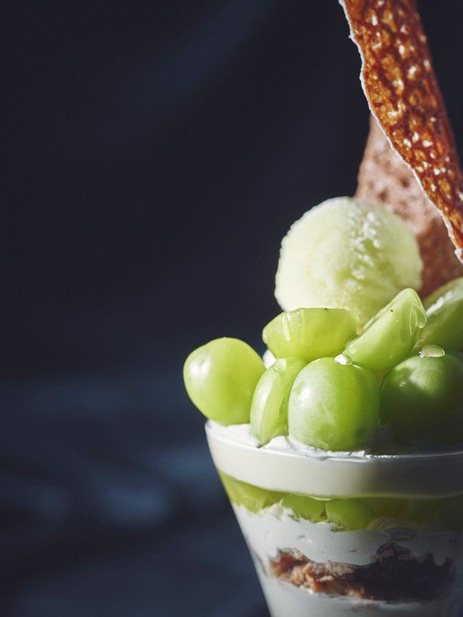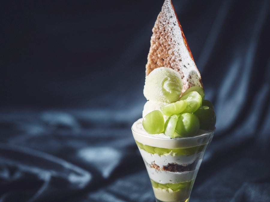 フレッシュなシャインマスカットにはじまり、ソルベ、マール酒フレーバーのパンナコッタやカスタードクリーム、シャンパンジュレ、白ブドウのジュレにいたるまで、ブドウを感じていただけるパフェ。