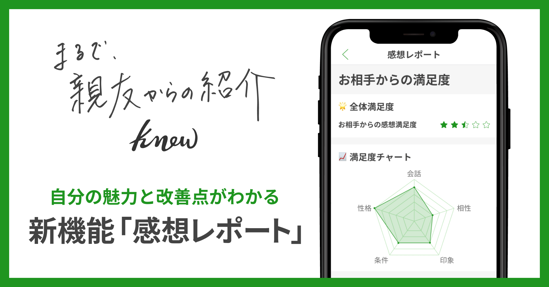 リブセンス 提案型マッチングアプリ『knew』に自分の魅力と改善点がわかる新機能「感想レポート」を追加