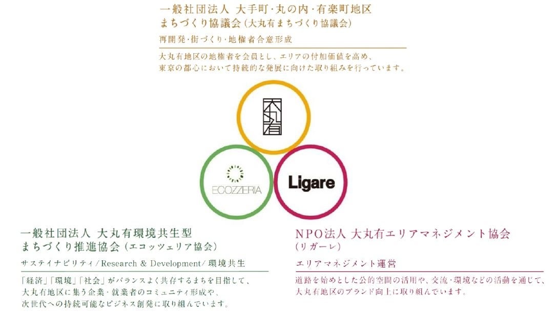 (*1)「一般社団法人 大手町・丸の内・有楽町地区まちづくり協議会(大丸有協議会)、NPO法人 大丸有エリアマネジメント協会(リガーレ)、一般社団法人 大丸有環境共生型まちづくり推進協会(エコッツェリア)」の3団体は連携して大丸有地区のまちづくりを推進しています。
