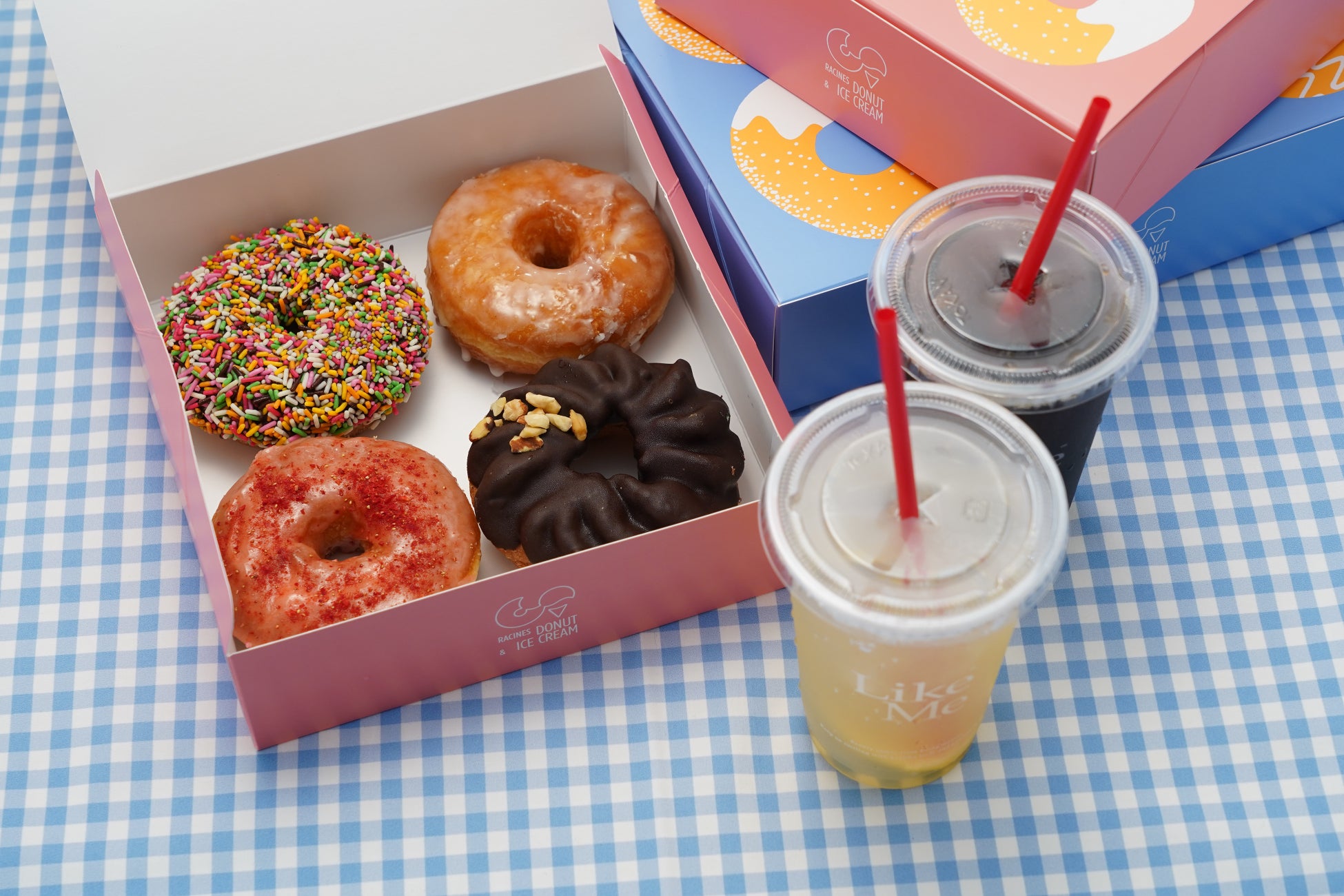 お好きなドーナツ4個とドリンク2個のセットのご注文でお会計10%OFFとなります!色とりどりの可愛いドーナツがピクニック気分をもっと盛り上げてくれます。